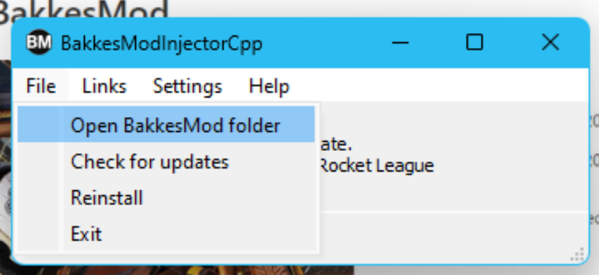 Sur la fenêtre de BakkesMod, ouvrir la section “File” puis cliquer sur “Open BakkesMod folder”.